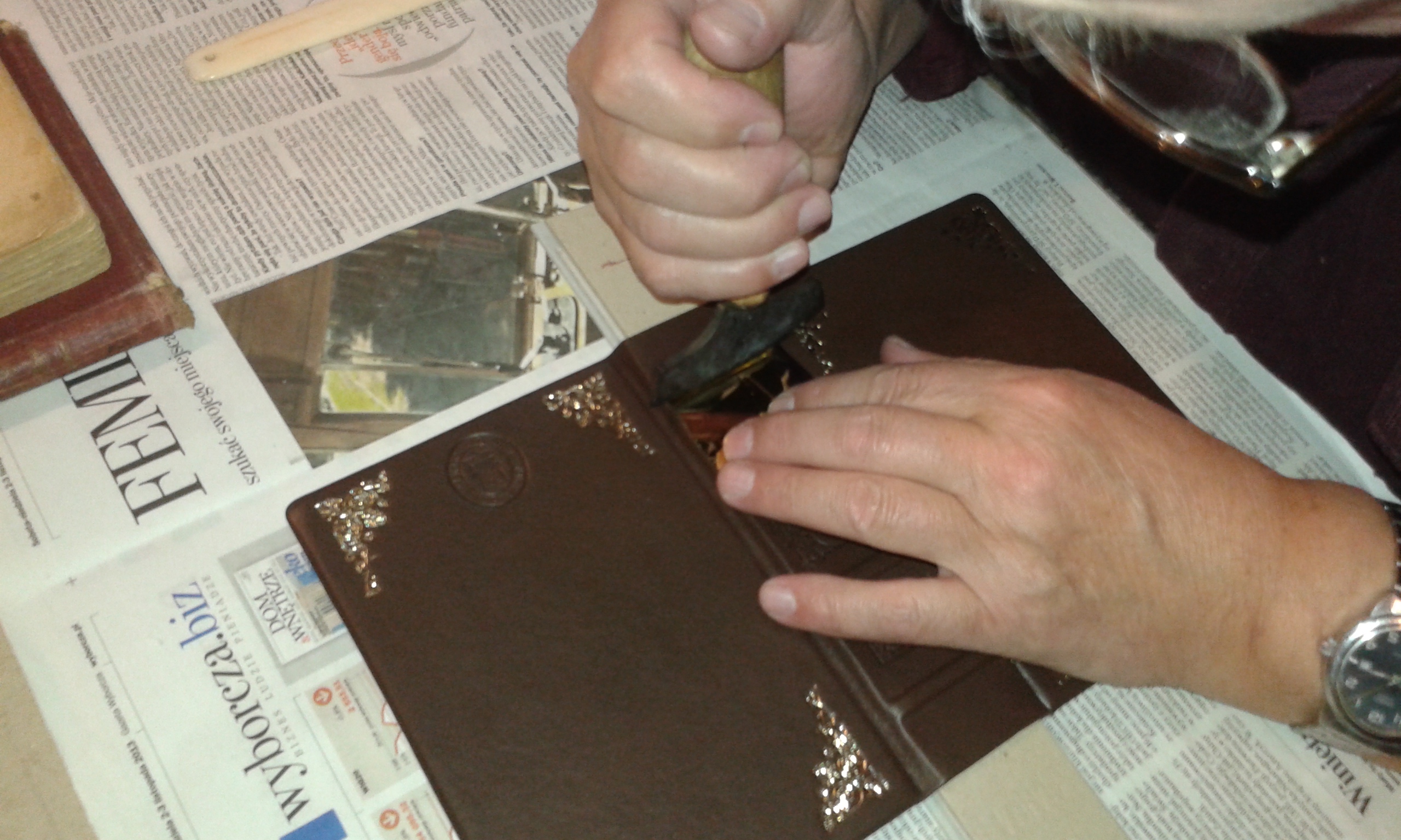 165. Skórzana okładka w fazie tłoczenia na goldprasie